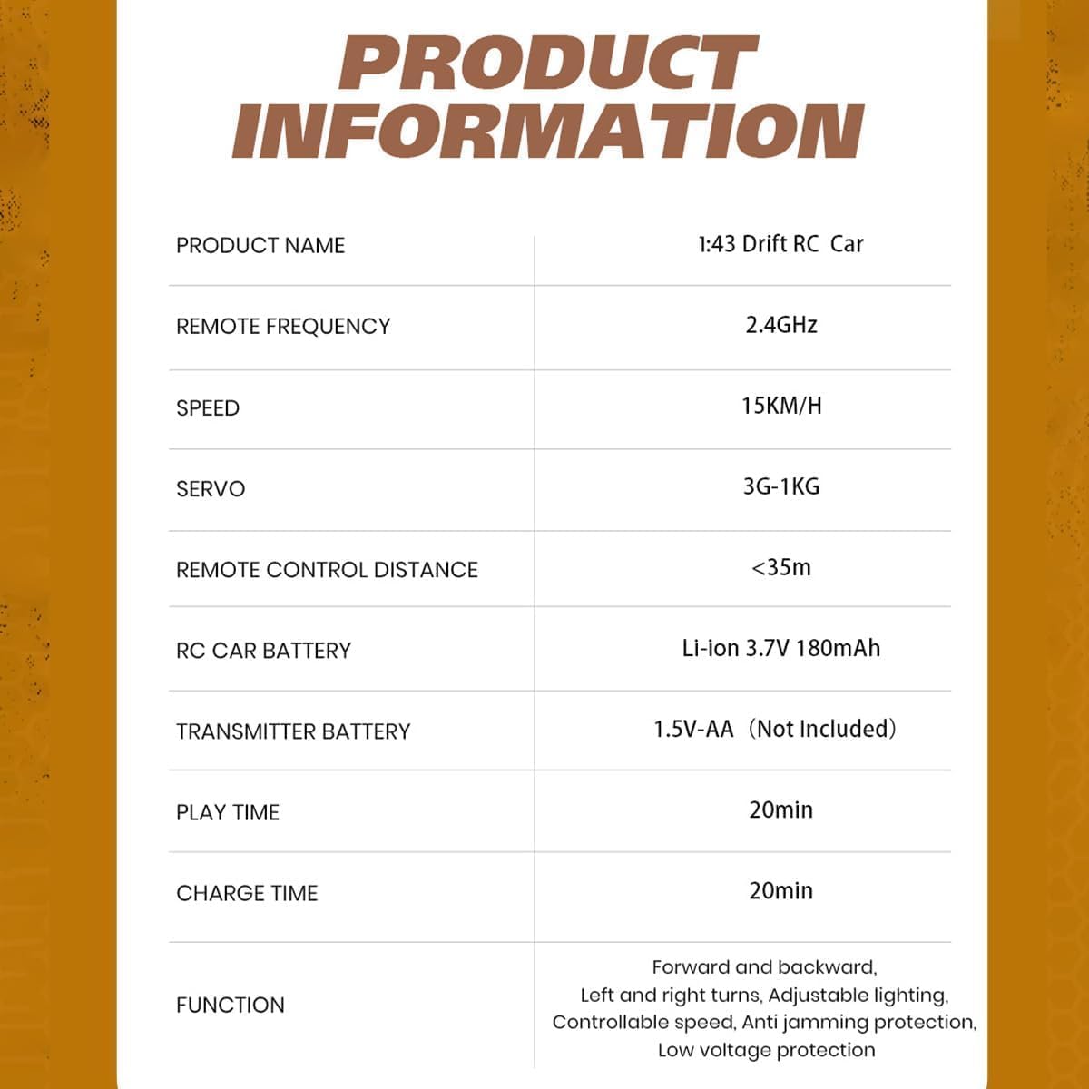 Material: Plastic + Metal + Electronic Components .Product Name: 1/43 Scale Mini RC Drift Racing Car .Item Number: 8500 .Scale: 1/43 .Product Dimensions: 11 × 4.9 × 2.9 cm .Drive System: 4WD (Four-Wheel Drive) .Top Speed: 15 KM/H .Motor Type: Hollow Cup Brushed Motor .Steering Servo: Digital Servo .Frequency: 2.4GHz .Control Distance: ≥ 30 meters .Remote Control Type: Full-Proportional Synchronized Control .Run Time: Approx. 20 minutes (at full speed) .Charging Time: Approx. 20 minutes .Remote Controller Battery: 4 × AAA batteries (not included) .Car Battery: 3.7V 150mAh Li-po battery (included) .Charger: USB Charger .Product Weight: 250g .Package Weight: 347g .Product Dimensions: 11 x 4.9 x 2.9cm .Package Dimensions: 21.5 x 16 x 8cm .Packing: Graphic Carton .Ages: 16+ Package Including .Remote control *1 .Charger Cable *1 .Manual *1 .Barricade Barrel *4