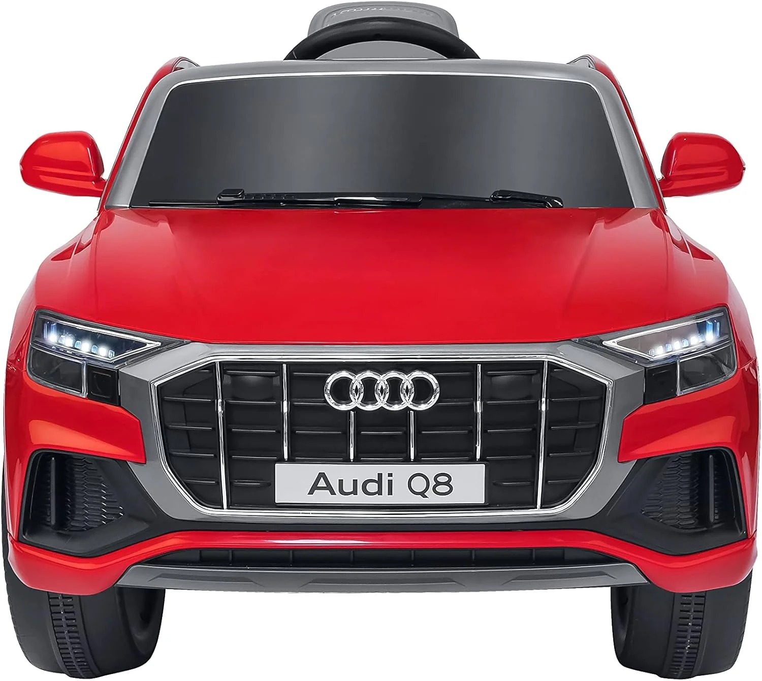 Audi Q8 Red Electric Suv Car 12 Volt 4.5 AH equipped with parental control thanks to the included remote control with 2.4 GHz frequency. The Audi Q8 SUV is faithfully reproduced in every detail to ensure a realistic and fun experience. The included battery can reach 3-5 km/h speed. The battery lasts 1-2 hours and needs a charging time of 8-10 hours. We recommend that the battery be fully charged before use. Plus & Design: Ignition with sound effects – Working horn – Seat belt – Opening doors – Reverse driving mode – Front and rear LED lights – Connecting and music thanks to USB, MP3 and TIF system – Rear suspension.