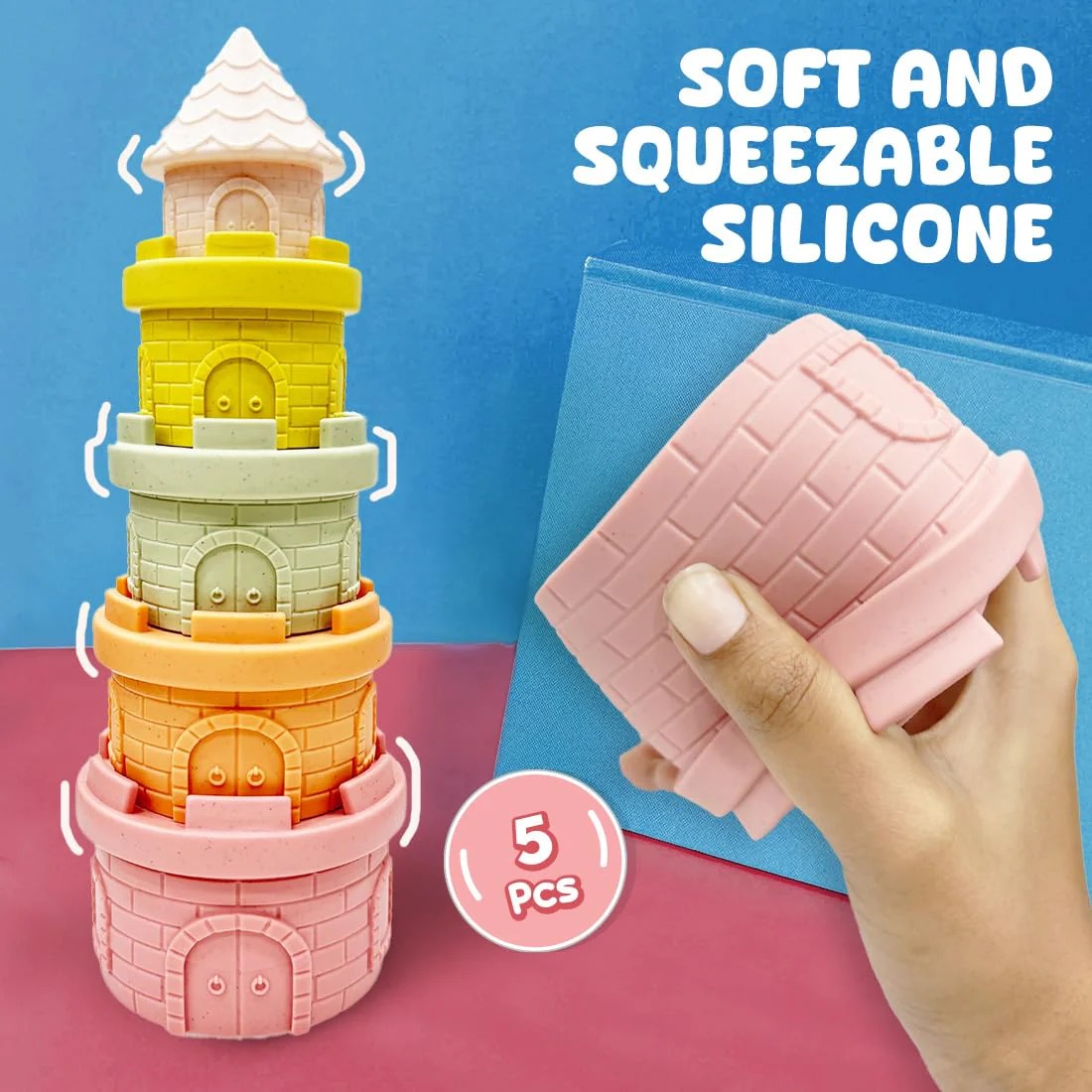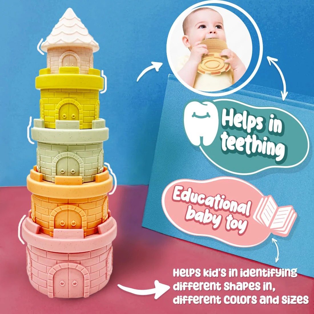 - Baby Teething Toys – Made from high-quality food-grade silicone, these stacking pieces are soft, non-toxic, and safe for teething. They help soothe gum discomfort during the molar phase, making them perfect for little ones to chew on.
