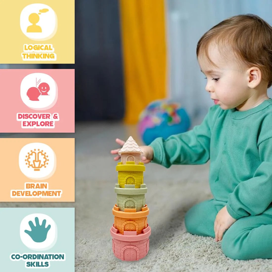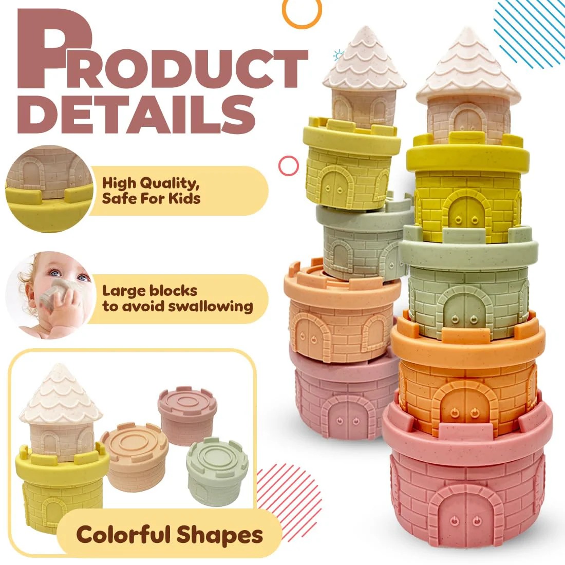 - Sensory & Interactive Play – Lightweight and easy to grasp, these castle-themed stacking toys enhance a baby’s sense of touch with embossed brick-like details.