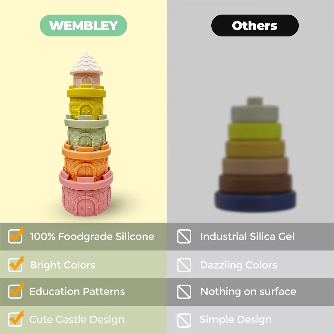 - tacking & Nesting Toys – Our building blocks feature a baby castle theme with textured brick patterns and 4 different-sized stacking pieces topped with a castle tower. Kids can stack them freely or sort them by size, helping them develop sequencing and hand-eye coordination.